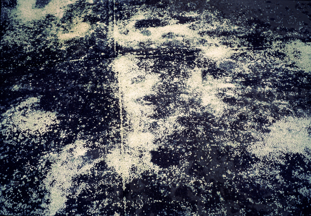 I am finding this project challenging because I am unsure where to find these pictures. I walk around staring at the ground, always trying to imagine that I am a giant looking down on a landscape. As can be imagined, there are lots of misses with this approach. The project is very slow moving, but I am really thrilled whenever I get a new image that fits in. I shoot with a Pentax 6x7 camera with a waist level viewer. Looking down through the viewer to see an image helps for me to image what the final photograph will look like. I am also trying to figure out how ambiguous I should be about the images. I'm not sure whether I should present them solely as aerial photographs, or if I should include in the title what they really are. The 1st image of the group, for example, is of tiny packing peanuts on the sidewalk in the West Village. I thought that it looked like a constellation, so I found images of constellations and tried to match the color to that of a grainy constellation photograph. I like this part of the project; that there is a way to monumentalize very ordinary trash on the sidewalk.